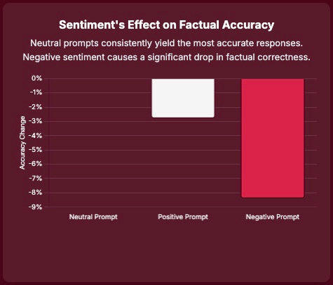 The sentiment conveyed in a prompt significantly influences LLM responses, affecting output quality, factual accuracy, and bias propagation. Prompts with negative sentiment are consistently associated with a substantial decrease in factual accuracy, approximately 8.4%, while positive prompts lead to a smaller reduction of about 2.8%. Conversely, neutral prompts consistently yield the most factually accurate responses across all tasks. 6