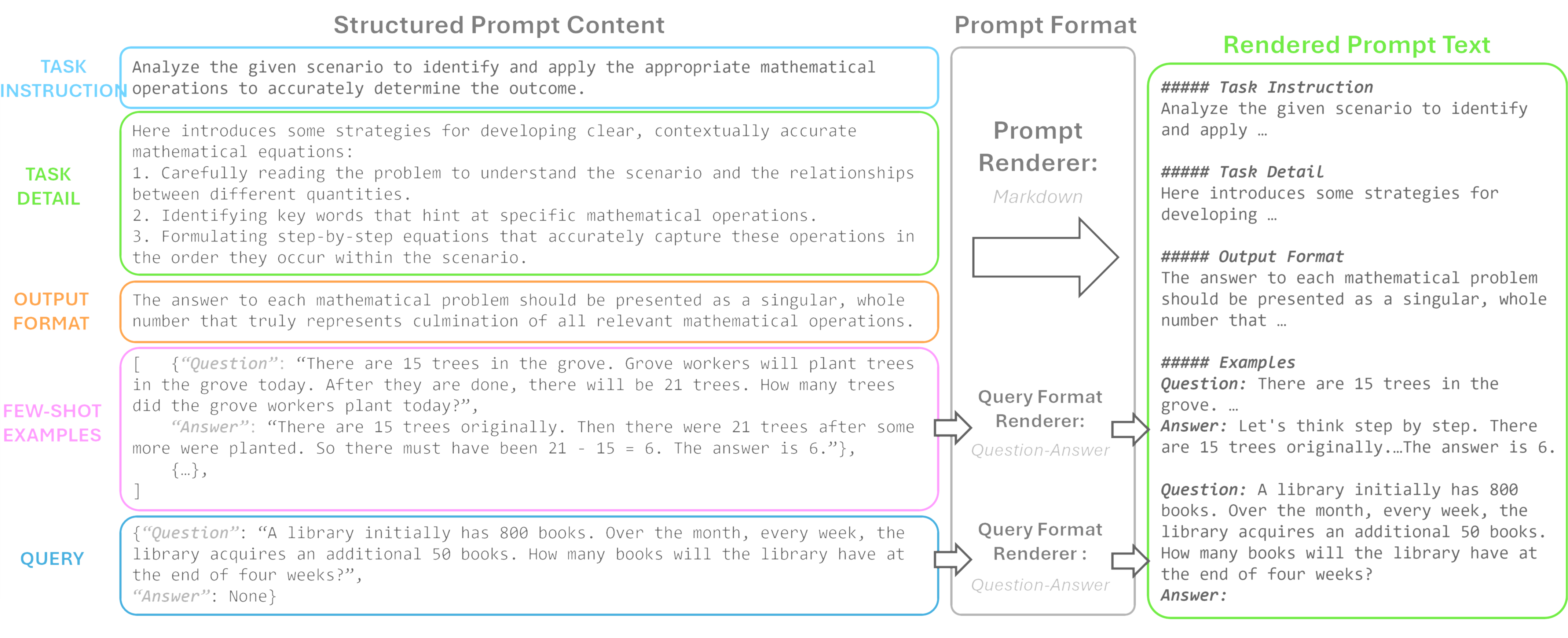 Beyond the explicit semantic content, the arrangement and presentation of prompt elements significantly influence LLM performance. Prompt formatting refers to the systematic arrangement and presentation of prompt content while preserving its semantic meaning. 3
