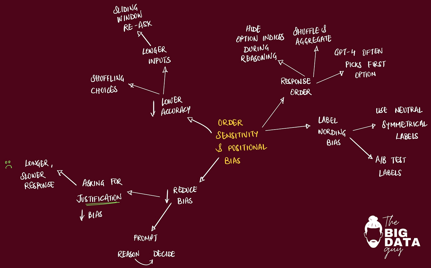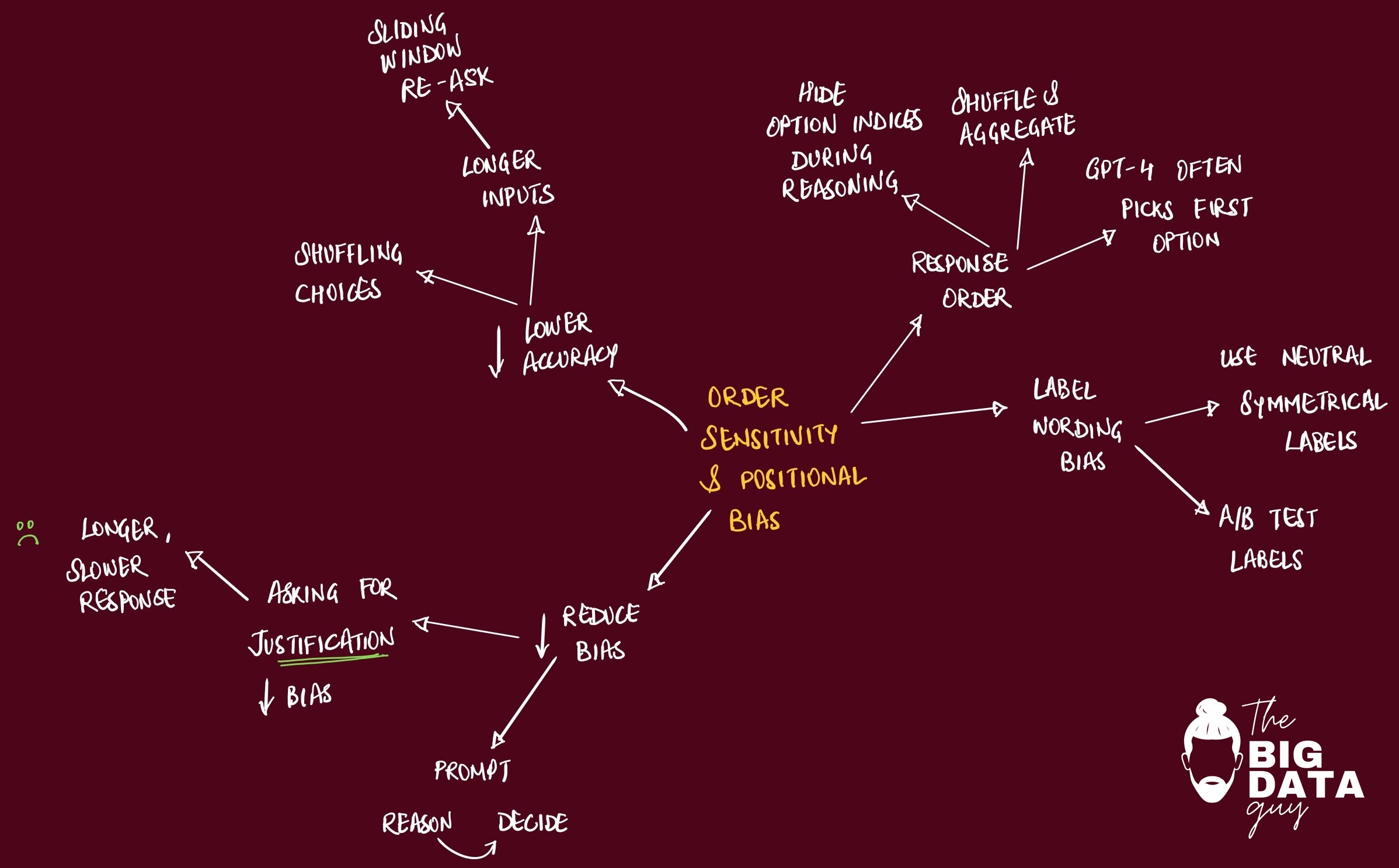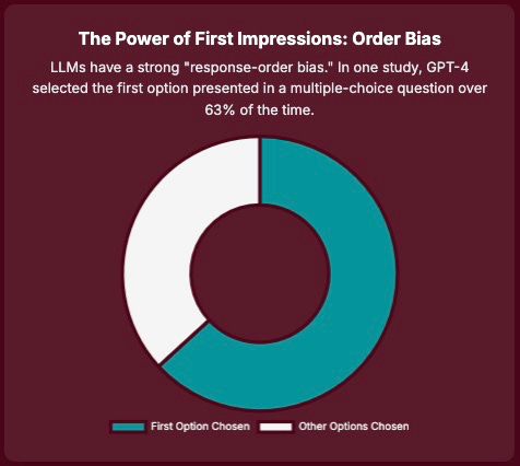 LLMs exhibit systematic biases based on the order in which information is presented within a prompt. This phenomenon includes "response-order bias," where LLMs demonstrate a tendency to favor the first option presented in a list or sequence. Additionally, "label bias" manifests as a preference for certain labels over others. For example, in one study, GPT-4 selected the first option in multiple-choice questions in over 63% of cases. 4